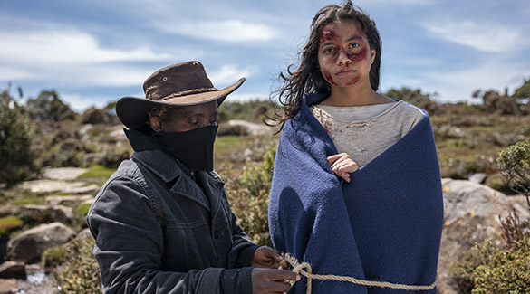 Blackwoman pulls BrownGirl (Deepthi Sharma) up the mountain.
